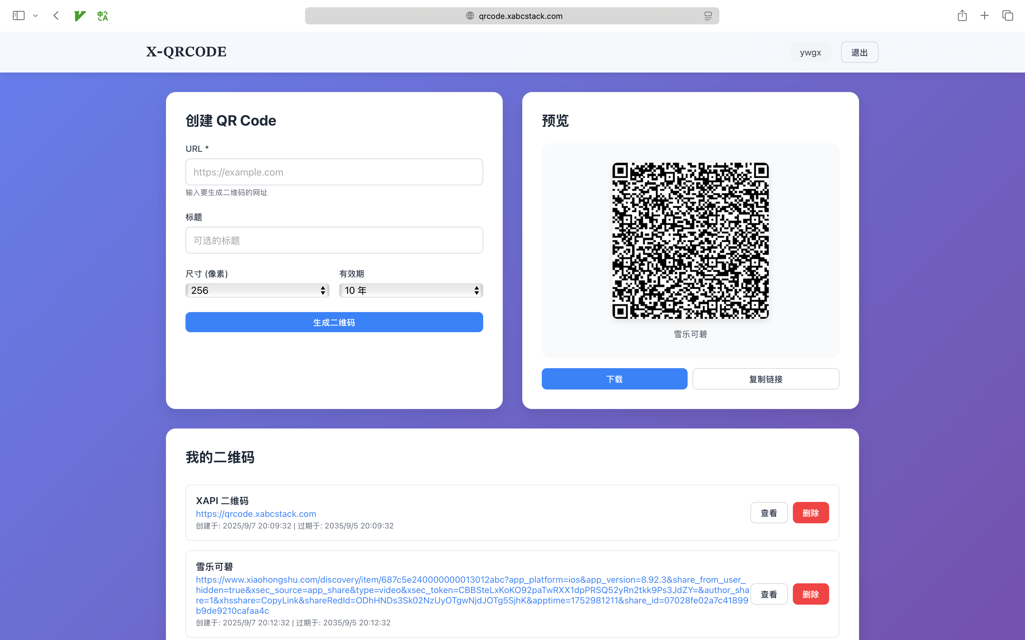 POST /x-qrcode,传入目标 URL、尺寸、有效天数等参数,即可获得 Base64 图片数据。 - 通过