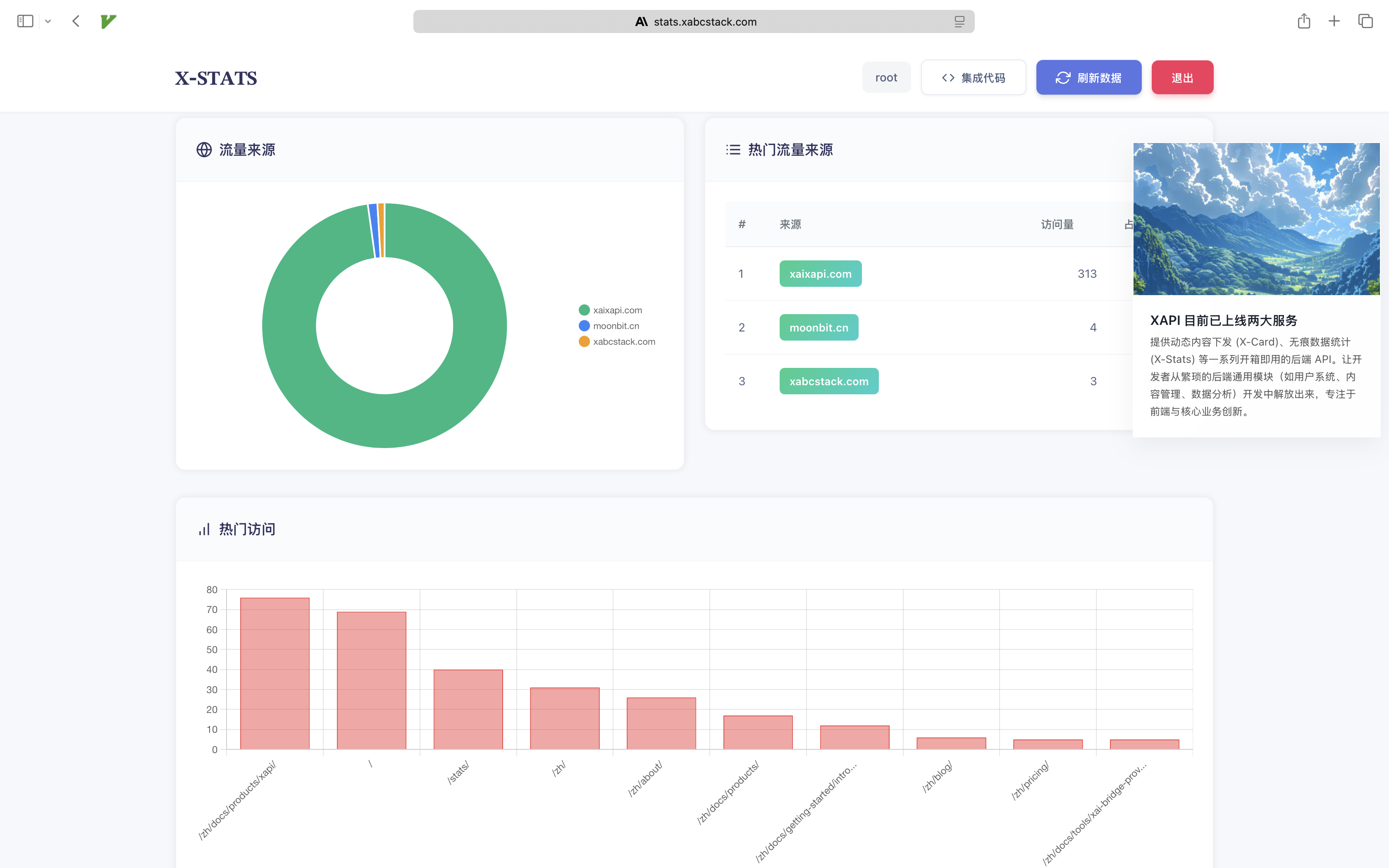 X-STATS 提供轻量、无 Cookie 的访问统计能力,专注于 URL 级 PV、来源域名与趋势分析,帮助团队快速搭建隐私友好的数据面板。